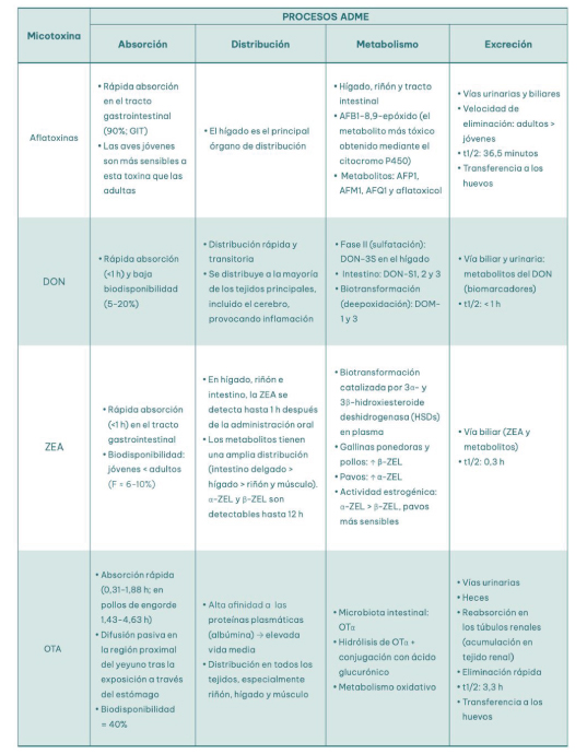 Especificado por la Autoridad Europea de Seguridad Alimentaria (EFSA, por sus siglas en inglés), el acrónimo ADME representa los cuatro procesos clave que describen cómo las toxinas entran en el organismo, se metabolizan y se eliminan «absorción, distribución, metabolismo y excreción». Estos procesos nos permiten comprender las alteraciones que se producen a nivel bioquímico, aplicar pruebas diagnósticas, proponer un tratamiento adecuado en casos de intoxicación y estudiar el desarrollo y uso de productos. Los procesos ADME son una herramienta necesaria para evaluar la eficacia de los productos desarrollados para mitigar.